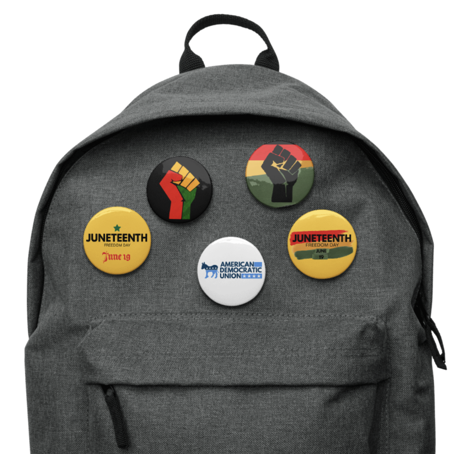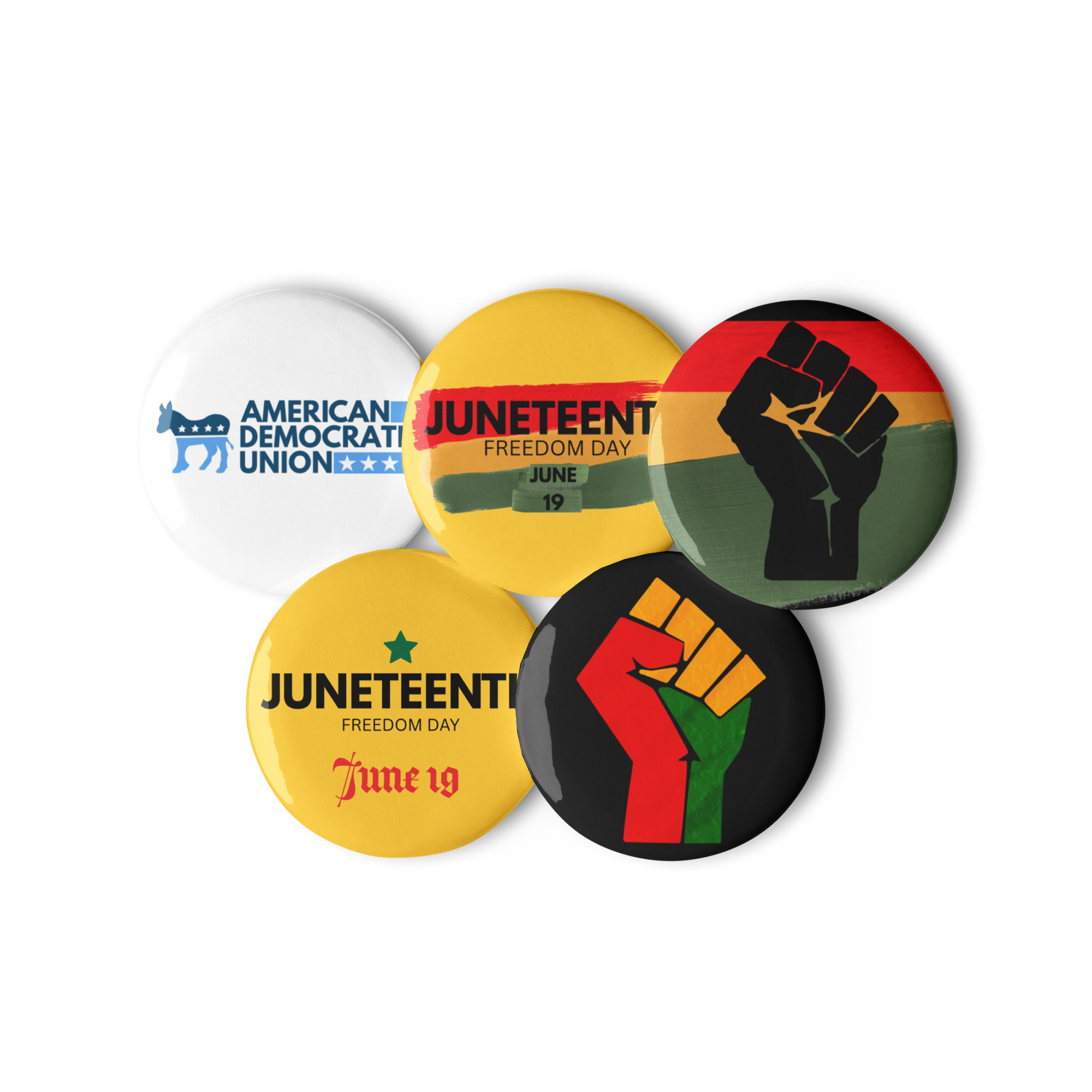 Featuring five bold, high-impact designs — from the Pan-African fist to powerful typography and the official American Democratic Union logo — these buttons are more than decoration. They are a tribute to the fight for liberation and a reminder that Juneteenth is not just history — it’s an ongoing call to action.